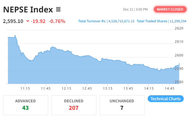 The Nepal Stock Exchange (NEPSE) recorded a loss today, declining by 19.92 points (0.76%) to settle at 2,595.10. This follows a 10.66 point loss in the previous session.