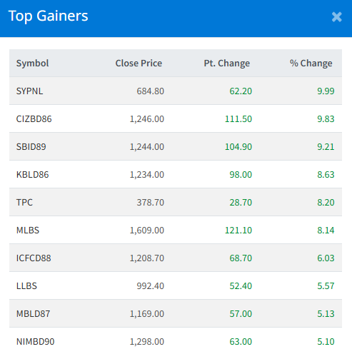 SY Panel Nepal Limited (SYPNL) led the gainers' list by 9.99% each.