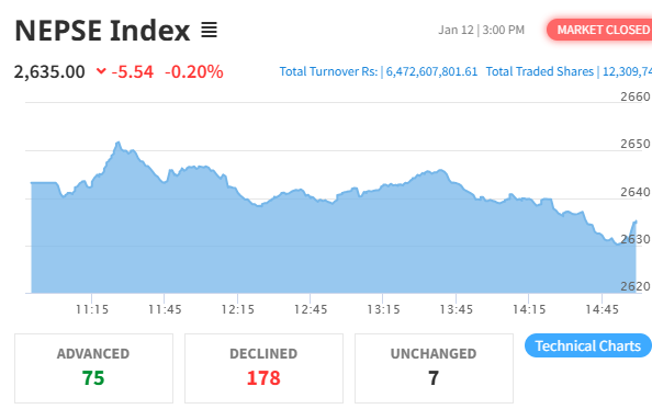 The Nepal Stock Exchange (NEPSE) recorded a loss today, losing by 5.54 points (0.20%) to settle at 2,635.00. This follows a 4.59 point gain the previous session.
