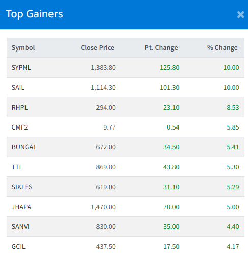 SY Panel Nepal Limited (SYPNL) and Shreenagar Agritech Industries Limited (SAIL) led the gainer's list with 10.00% each.