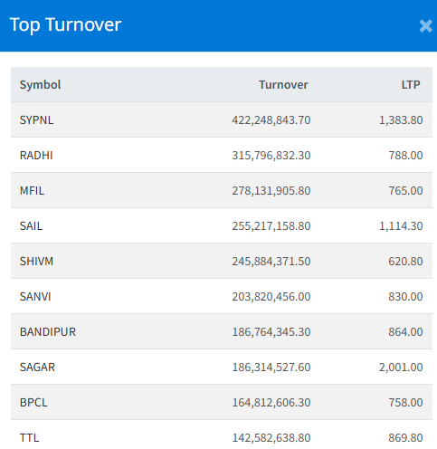 SY Panel Nepal Limited (SYPNL) topped the turnover chart, amounting to Rs. 42.24 crores. The stock closed at Rs. 1,383.80.