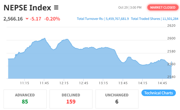Nepse Index Dips By 5.17 Points To Close at 2,566.16 level ; UNHPL Leads Turnover While Overall Volume Stood at 5.45 Arba