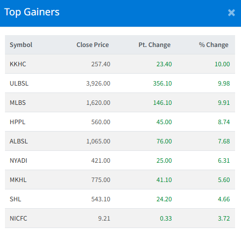 Khanikhola Hydropower Co. Ltd. (KKHC) led the gainer's list with 10.00%.