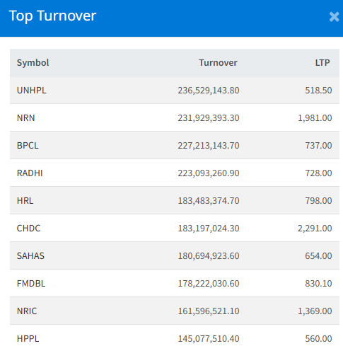 Union Hydropower Limited (UNHPL) topped the turnover chart, amounting to Rs. 23.65 Crores. The stock closed at Rs. 518.50.