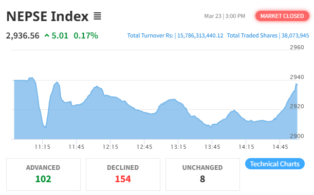 The Nepal Stock Exchange (NEPSE) recorded a gain today, gaining by 5.01 points (0.17%) to settle at 2,936.56. This follows a 54.51 point gain in the previous session.