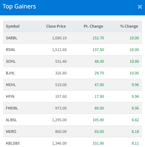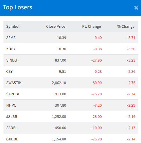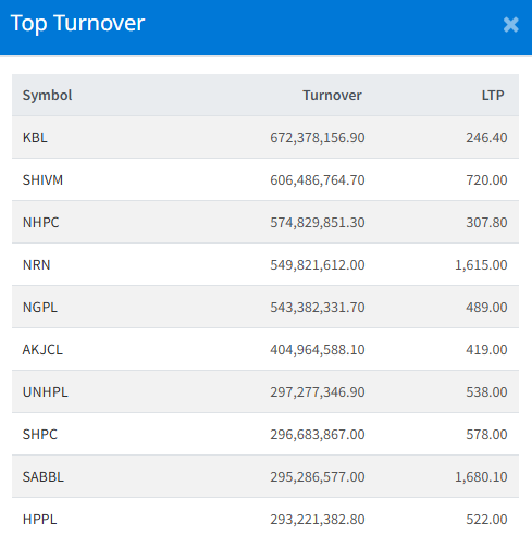 Kumari Bank Limited (KBL) topped the turnover chart, amounting to Rs. 67.23 crores. The stock closed at Rs. 246.40