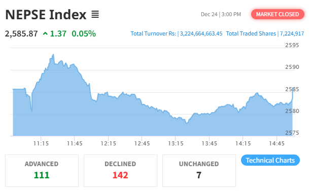The Nepal Stock Exchange (NEPSE) recorded a gain today, gaining by 1.37 points (0.05%) to settle at 2,585.87. This follows a 3.27 point gain in the previous session.