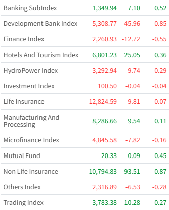 Among sectors, the Non Life Insurance registered the highest gain, gaining 0.87%, while the Development Bank Index saw the highest loss at 0.85%.
