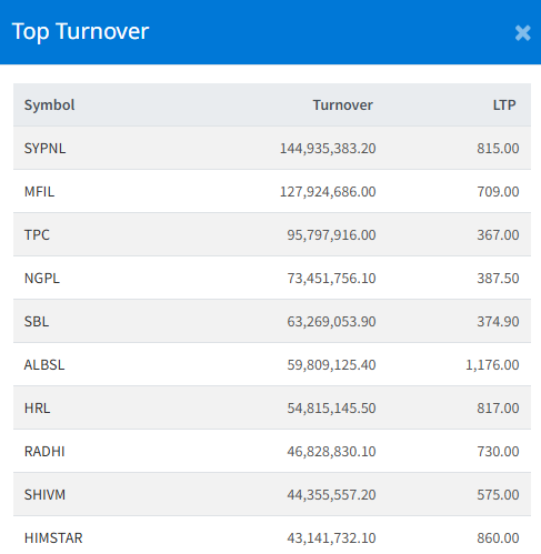 SY Panel Nepal Limited (SYPNL) topped the turnover chart, amounting to Rs. 14.49 crores. The stock closed at Rs. 815.00.
