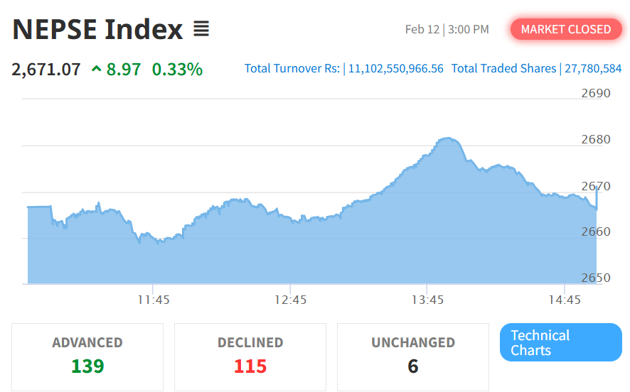 The Nepal Stock Exchange (NEPSE) recorded a gain today, gaining by 8.97 points (0.33%) to settle at 2,671.07. This follows a 0.04 point loss in the previous day.