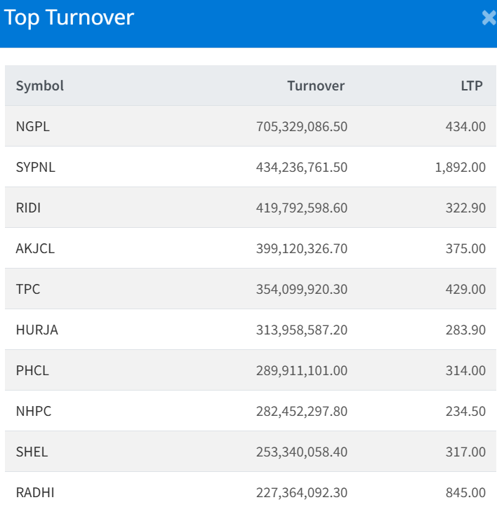 Ngadi Group Power Ltd. (NGPL) topped the turnover chart, amounting to Rs. 70.53 crores. The stock closed at Rs. 434.00.