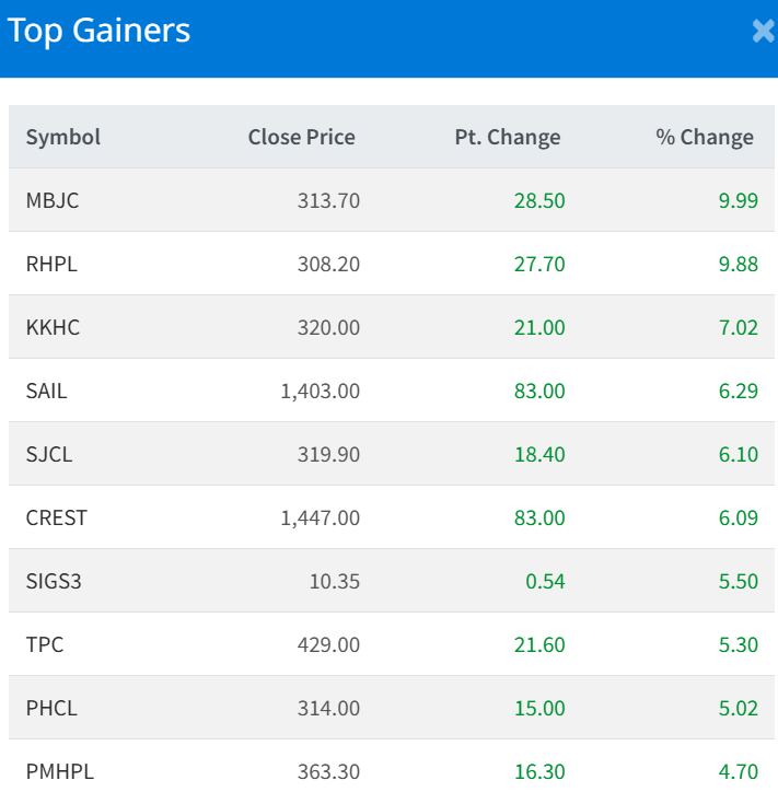 Madhya Bhotekoshi Jalavidyut Company Limited (MBJC) led the gainers list with 9.99% change in its price.