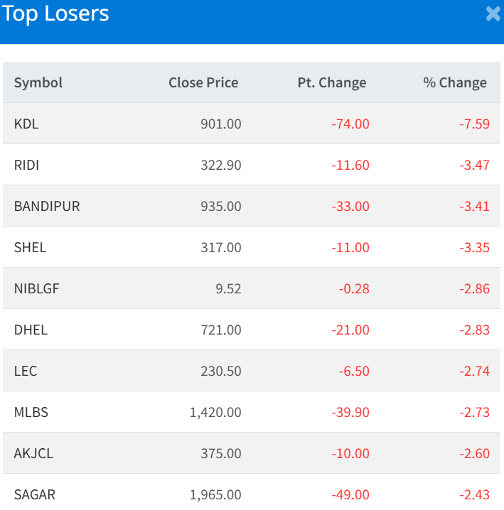 Kalinchowk Darshan Limited (KDL) recorded the steepest drop, falling 7.59%.