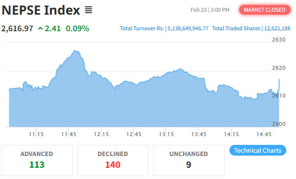 NEPSE Index Gains Minimal 2.41 Points to Close at 2,616.97 With Over 5 Arba Turnover