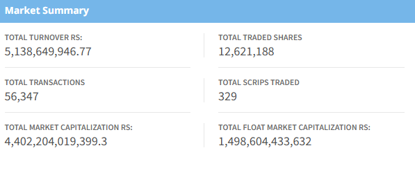 The benchmark index opened at 2,613.4, touching an intraday high of 2,627.06 and a low of 2,608.95. Total turnover for the day reached Rs. 5.13 arba, with 12,621,188 shares traded across 329 companies through 56,347 transactions. Market capitalization stood at Rs. 44.02 kharba, with a float market capitalization of Rs. 14.98 Kharba.
