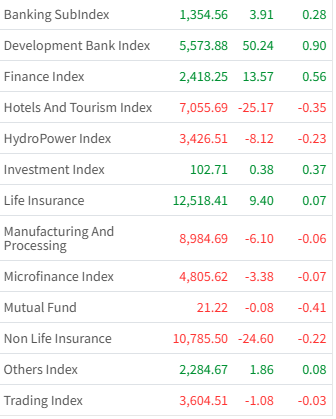 Among the sectors, Development Bank Index witnessed a highest gain by 0.90 %, while Mutual Fund recorded a highest loss by 0.41%.
