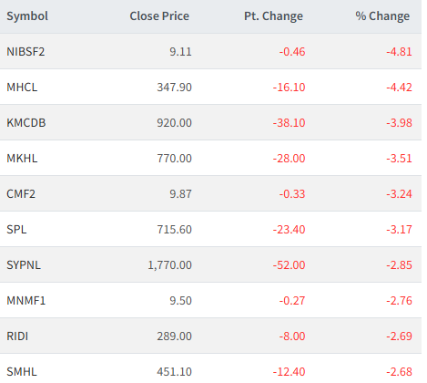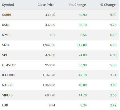 Salapa Bikas Bank Limited (SABBL) led the gainer list with 9.99% change in its price. The stock closed at Rs 439.20.