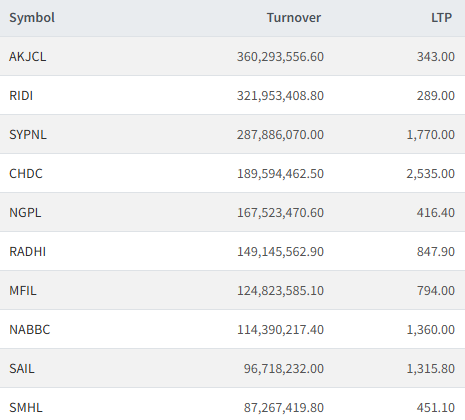 Ankhu Khola Jalvidhyut Limited (AKJCL) topped the turnover chart, amounting to Rs. 36.02 crores. The stock closed at Rs. 343.
