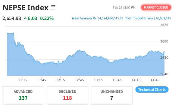 The Nepal Stock Exchange (NEPSE) recorded a gain today on the last trading day of this week, gaining by 6.03 points (0.22%) to settle at 2,654.93. This follows a 10.30 point gain in the previous day.