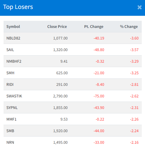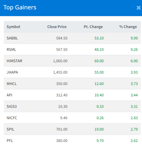 Salapa Bikas Bank Limited (SABBL) led the gainer list with 9.99% change in its price. The stock closed at Rs. 584.50.
