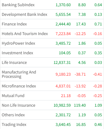 Among the sectors, Non Life Insurance witnessed a highest gain by 1.09%, while Manufacturing And Processing recorded a highest loss by 0.41%.