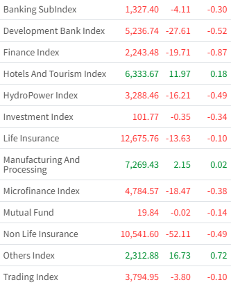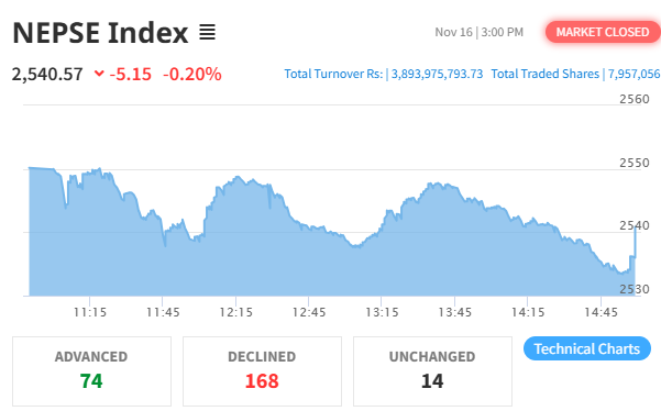 NEPSE Index Loses 5.15 Points to Close at 2,540.57; Only Three Indices Close At Green