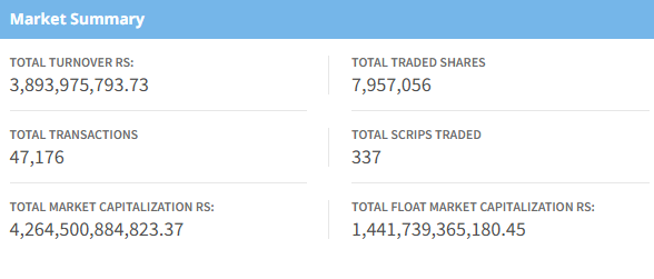 The benchmark index opened at 2550.18, touching an intraday high of 2,550.18, while the lowest point was 2,533.03. Total turnover for the day reached Rs. 3.89 Arba, with 7,957,056 shares traded across 337 companies through 47,176 transactions. Market capitalization stood at Rs. 42.64 Kharba, with a float market capitalization of Rs. 14.41 Kharba.