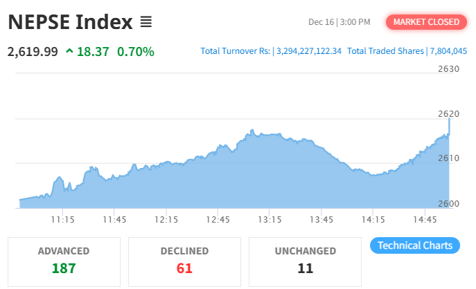 The Nepal Stock Exchange (NEPSE) recorded a gain today, increasing by 18.37 points (0.70%) to settle at 2,619.99. This follows a 6.74 point gain in the previous session.