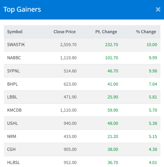 Swastik Laghubitta Bittiya Sanstha Limited (SWASTIK) and Narayani Development Bank Limited (NABBC) led the gainers' list by 10.00% each.