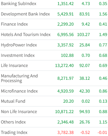 Among sectors, the Trading Index registered the highest loss, losing 0.01%, while the Development Index saw the highest gain at 1.56%.