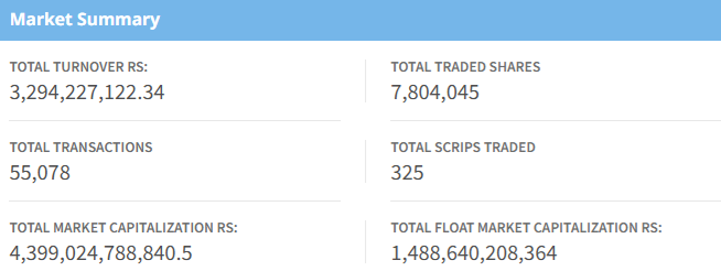 The benchmark index opened at 2,601.81, touching an intraday high of 2,619.99, while the lowest point was 2,600.86. Total turnover for the day reached Rs. 3.29 Arba, with 7,804,045 shares traded across 325 companies through 55,078 transactions. Market capitalization stood at Rs. 43.99 Kharba, with a float market capitalization of Rs. 14.88 Kharba.
