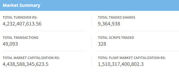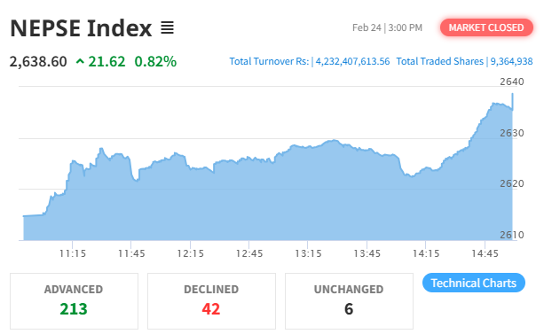 The benchmark index opened at 2,614.67, touching an intraday high of 2,638.64 and a low of 2,614.26. Total turnover for the day reached Rs. 4.23 arba, with 9,364,938 shares traded across 329 companies through 49,093 transactions. Market capitalization stood at Rs. 44.38 kharba, with a float market capitalization of Rs. 15.10 Kharba.