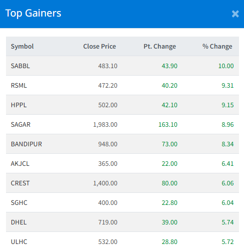 Salapa Bikas Bank Limited (SABBL) led the gainer list with 10.00% change in its price. The stock closed at Rs. 483.10.