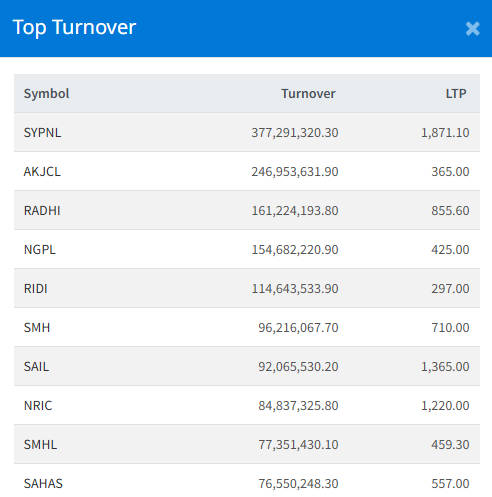 SY Panel Nepal Limited (SYPNL) topped the turnover chart, amounting to Rs. 37.72 crores. The stock closed at Rs. 1,871.10 .