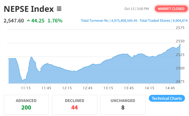 The Nepal Stock Exchange (NEPSE) recorded a gain today, gaining 44.25 points (1.76% ) to settle at 2,547.60. This follows a 78.83 -point loss in the previous session.