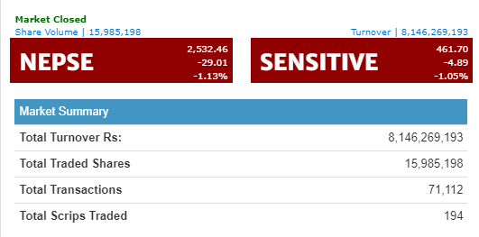 The NEPSE index lost 29.01 points today and closed at 2,532.46. The index opened at 2,562.43 and made an intraday high at 2,585.15. While the index went as low as 2,524.44, it ultimately closed at 2,532.46.