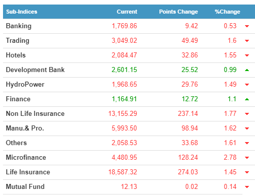Only Development Banks and Finance gained today while all other sectors closed red. While Finance gained the most 1.1%, Microfinance lost the most 2.78%.