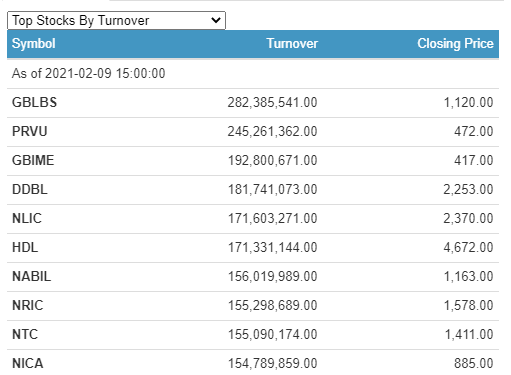 Grameen Bikas Laghubitta Bittiya Sanstha Limited (GBLBS) has the highest individual scrip turnover of a little over Rs. 28.23 crores. The shares of Prabhu Bank Limited (PRVU) traded the most.