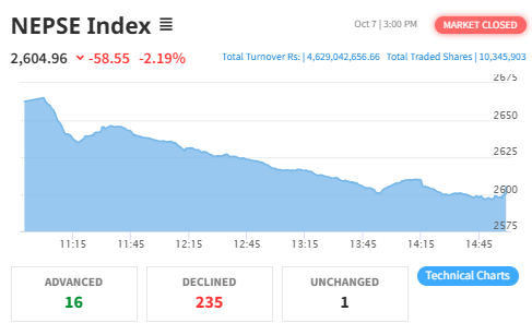The Nepal Stock Exchange (NEPSE) recorded a loss today, losing 58.55 points (2.19%) to settle at 2,604.96. This follows a 11.51 -point gain in the previous session.
