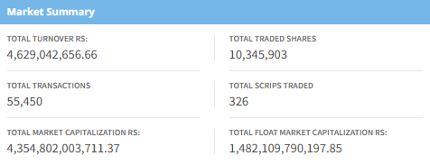 The benchmark index opened at 2,662.51, touching an intraday high of 2,664.99, while the lowest point was 2,596.04. Total turnover for the day reached Rs. 4.62 Arba, with 10,345,903 shares traded across 326 companies through 55,450 transactions. Market capitalization stood at Rs. 43.54 Kharba, with a float market capitalization of Rs. 14.82 Kharba.
