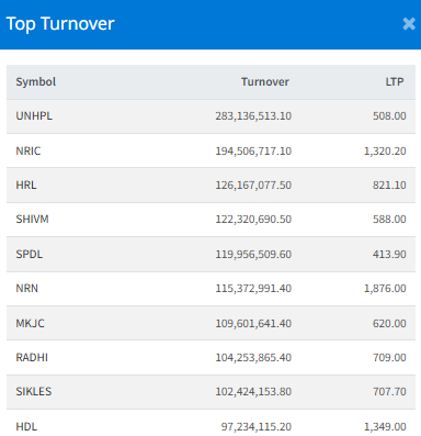 Union Hydropower Limited (UNHPL) topped the turnover chart, amounting to Rs. 28.31 Crores. The stock closed at Rs. 508.00.