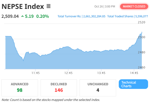The Nepal Stock Exchange (NEPSE) recorded a gain today, gaining 5.19 points (0.20% ) to settle at 2,509.04. This follows a 16.67-point loss in the previous session.