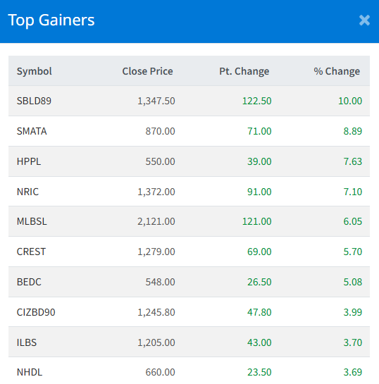 10.75% SBL Debenture 2089 (SBLD89) led the gainer's list with 10.00%.