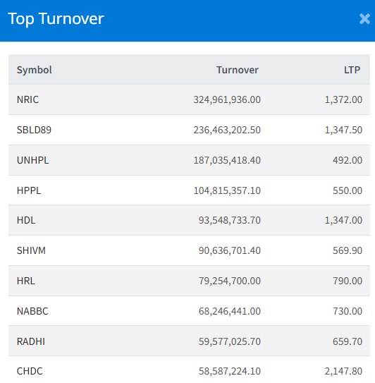 Nepal Reinsurance Company Limited (NRIC) topped the turnover chart, amounting to Rs. 32.49 Crores. The stock closed at Rs. 1,372.00.