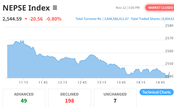 NEPSE Plummets 20.56 Points To Settle at 2,544.59; Only One Sector Close at Green While Overall Turnover Stood at 3.84 Arba