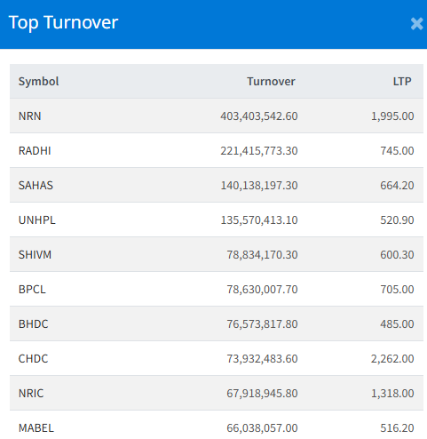 NRN Infrastructure and Development Limited (NRN) topped the turnover chart, amounting to Rs. 40.34 crores. The stock closed at Rs.1,995.00.