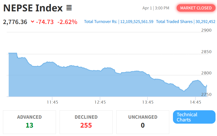 The Nepal Stock Exchange (NEPSE) recorded a Sharp Decline today, declining by 74.73 points (2.62%) to settle at 2,776.36. The chart shows there are no buyers in the market and selling pressure is heavy, and investor are loosing the confidence over the market due sharp decline today.