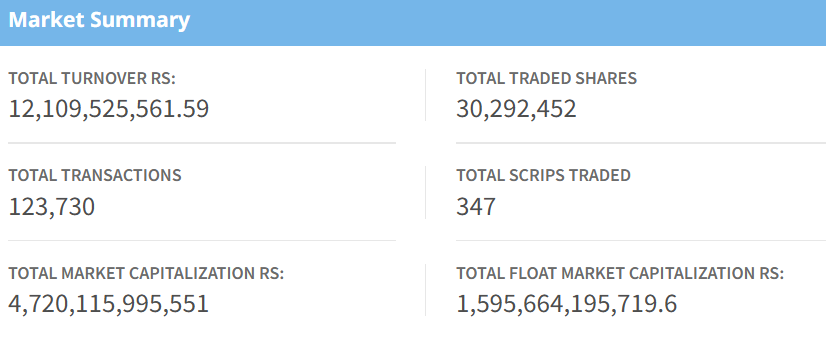 The benchmark index opened at 2,851.64, touching an intraday high of 2,851.65, while the lowest point was 2,761.27. Total turnover for the day reached Rs. 12.10 Arba, with 30,292,452 shares traded across 347 companies through 123,730 transactions. Market capitalization stood at Rs. 47.20 Kharba, with a float market capitalization of Rs. 15.95 Kharba.