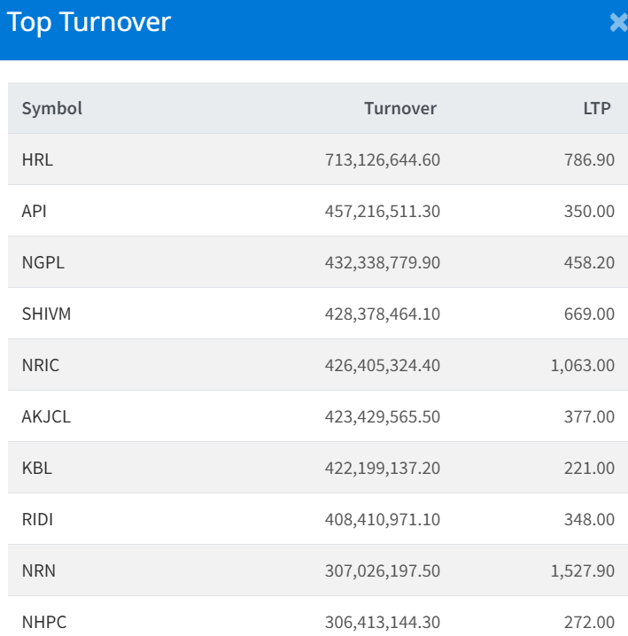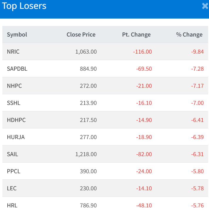 Meanwhile, Nepal Reinsurance Company Limited recorded the Highest fall, falling 9.84% and it's last trading price is Rs. 1,063. The prices changes by 116.0 point from the previous day.