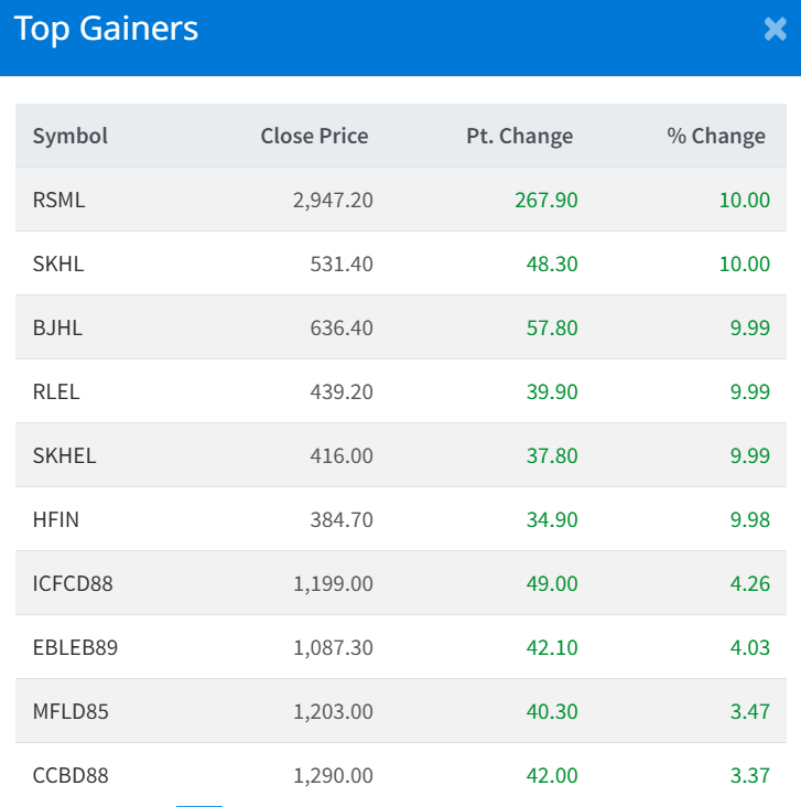 Five companies hit the upper circuit of 10% that includes RSML, BJHL, SKHL, RLEL, SKHEL and HFIN recorded 9.98% positive change in its prices.